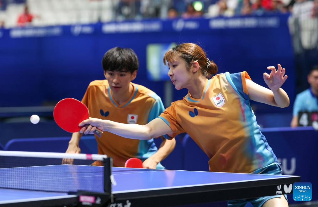 Okano Shunsuke/Idesawa Kyoka (R) compete during the table tennis mixed doubles gold medal match between Zeng Beixun/Han Feier of China and Okano Shunsuke/Idesawa Kyoka of Japan at the Rhine-Ruhr 2025 FISU World University Games in Essen, Germany, July 22, 2025. (Xinhua/Zhang Fan)