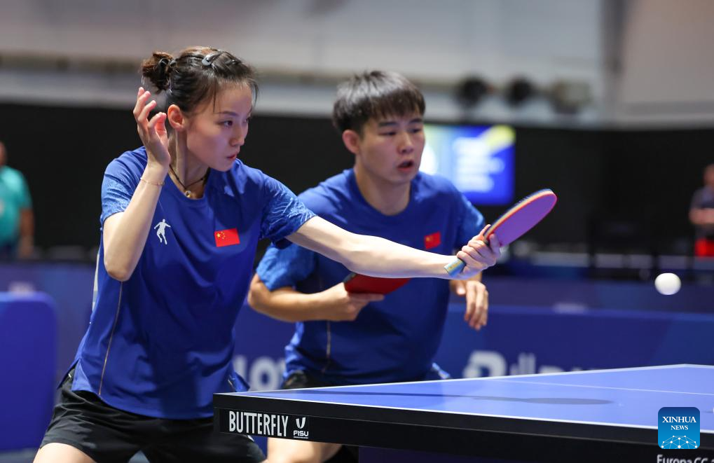 Zeng Beixun (L)/Han Feier compete during the table tennis mixed doubles gold medal match between Zeng Beixun/Han Feier of China and Okano Shunsuke/Idesawa Kyoka of Japan at the Rhine-Ruhr 2025 FISU World University Games in Essen, Germany, July 22, 2025. (Xinhua/Zhang Fan)