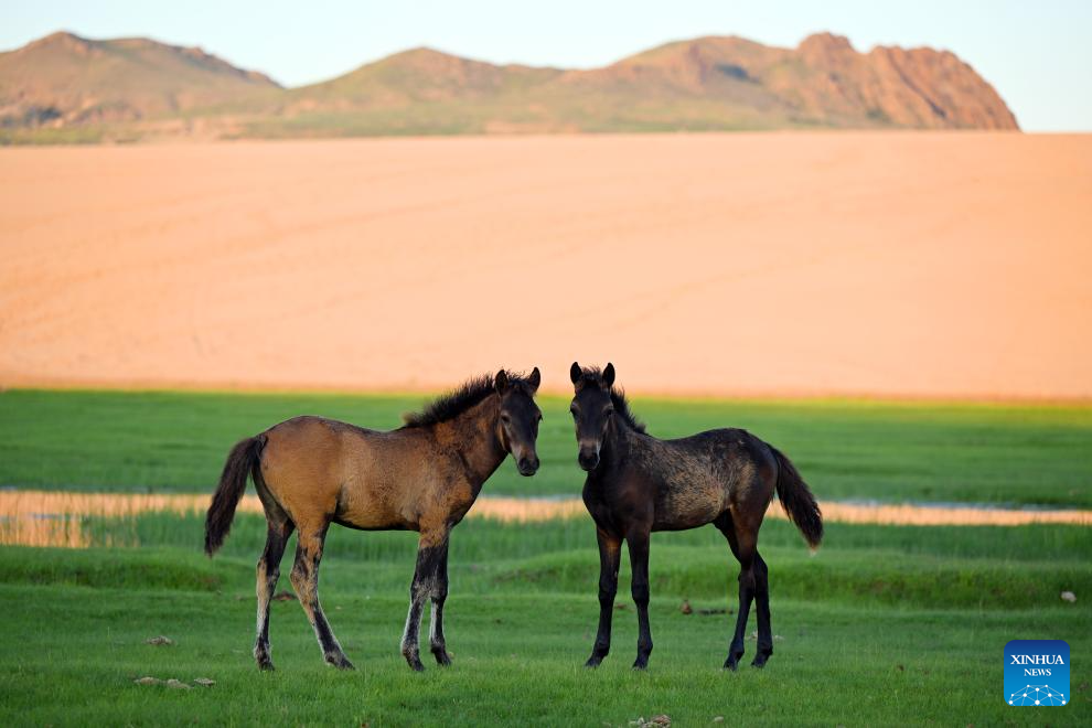 Two horses are seen on a sandy grassland in Chifeng City, north China's Inner Mongolia Autonomous Region, July 21, 2025. (Photo by Ma Weibing/Xinhua)