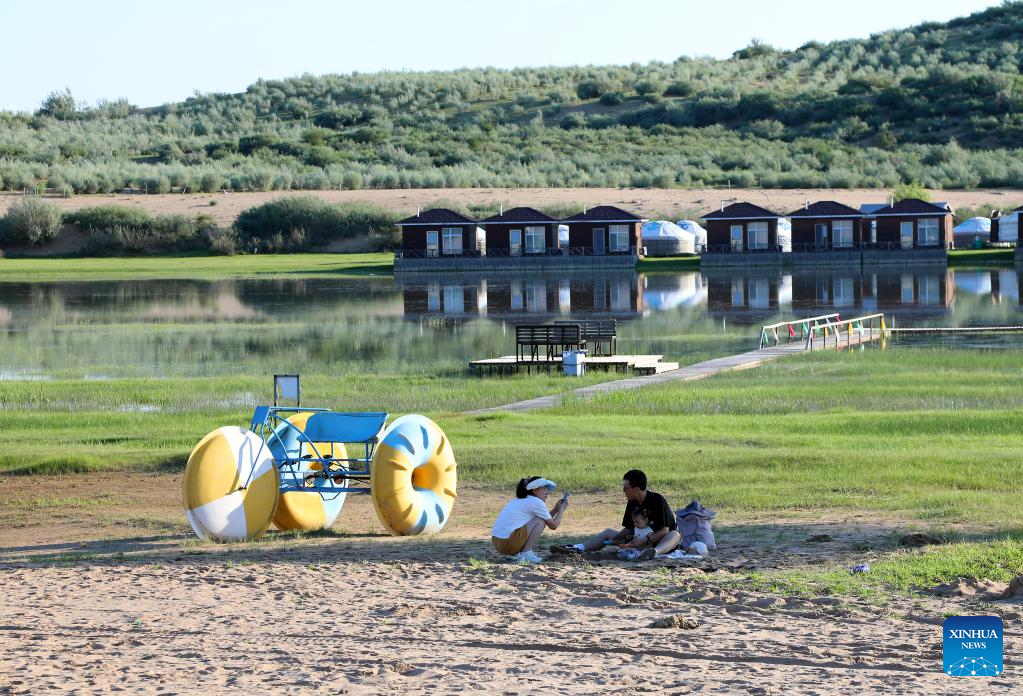 Tourists rest on a sandy grassland in Chifeng City, north China's Inner Mongolia Autonomous Region, July 21, 2025. (Xinhua/Hou Jun)