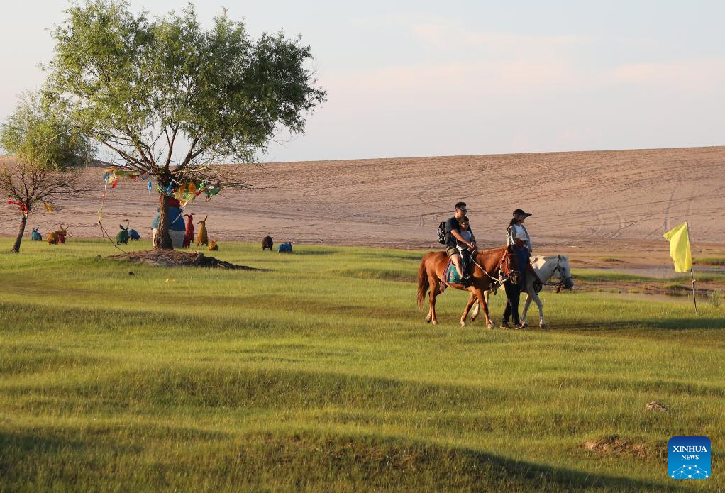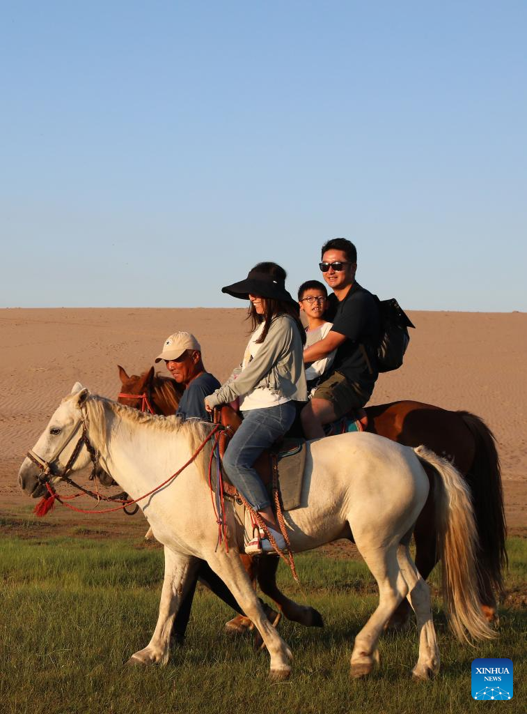 Tourists ride horses on a sandy grassland in Chifeng City, north China's Inner Mongolia Autonomous Region, July 21, 2025. (Xinhua/Hou Jun)