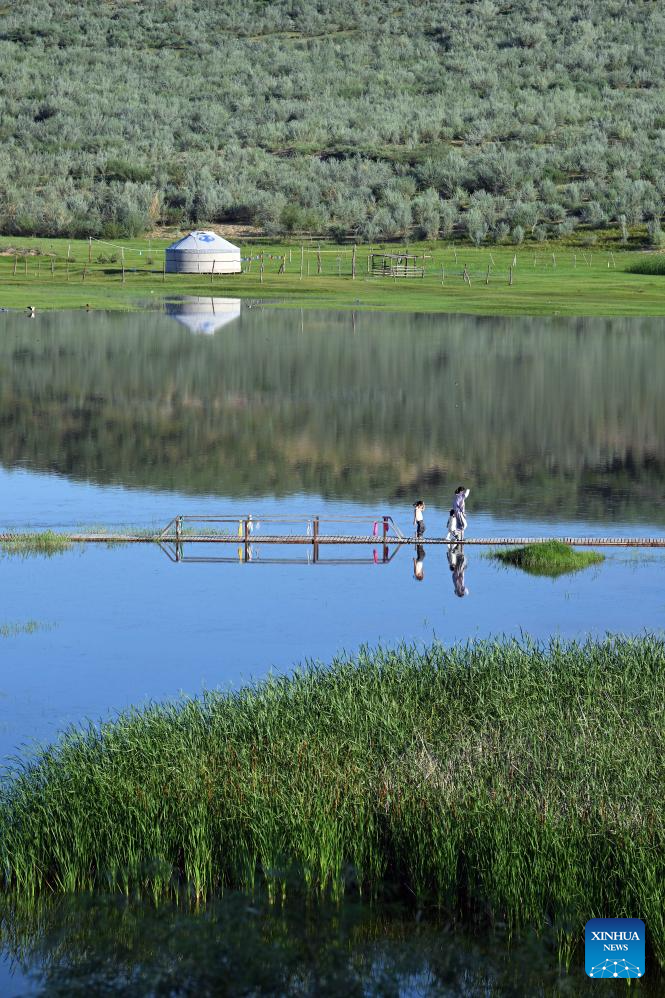 Tourists visit a grassland lake in Chifeng City, north China's Inner Mongolia Autonomous Region, July 21, 2025. (Photo by Ma Weibing/Xinhua)
