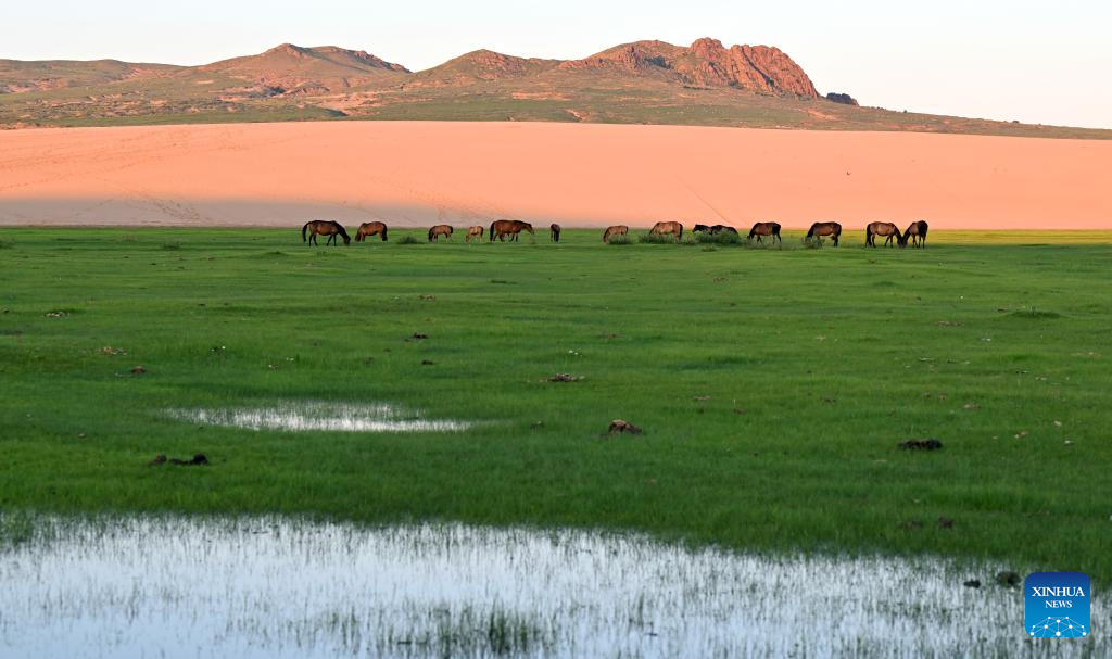 A herd of horses graze on a sandy grassland in Chifeng City, north China's Inner Mongolia Autonomous Region, July 21, 2025. (Photo by Ma Weibing/Xinhua)