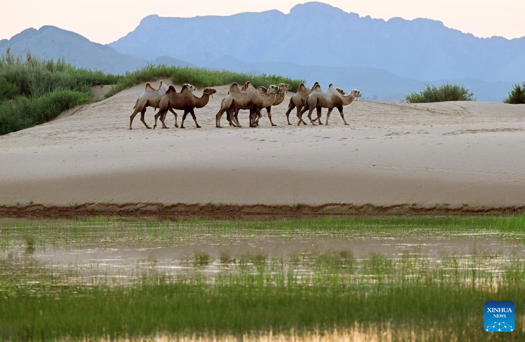Camels walk on a sandy grassland in Chifeng City, north China's Inner Mongolia Autonomous Region, July 21, 2025. (Photo by Ma Weibing/Xinhua)