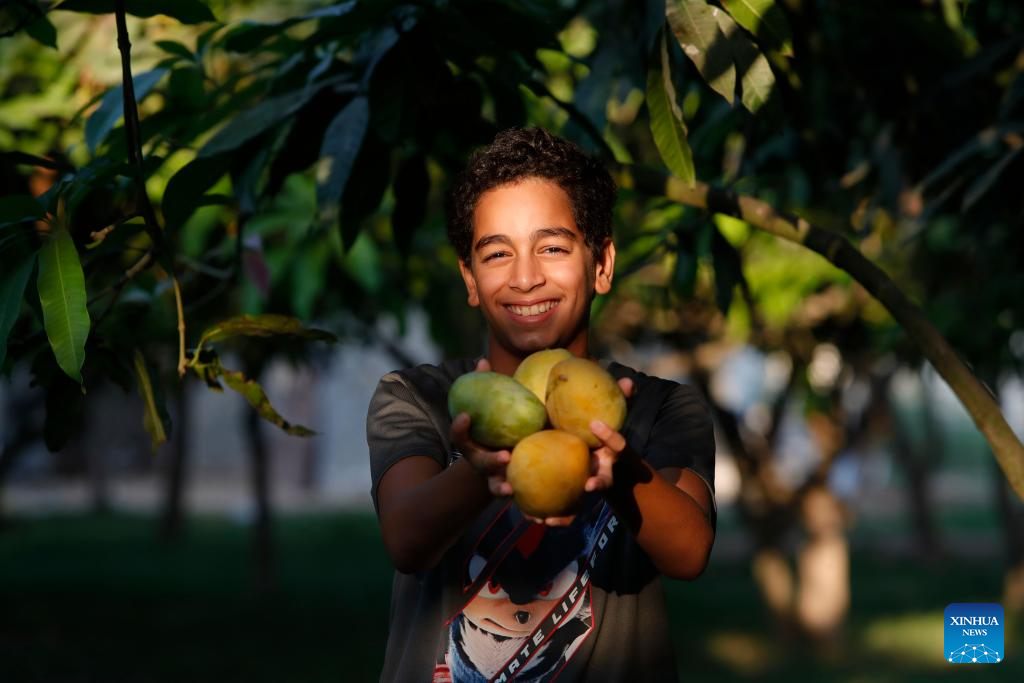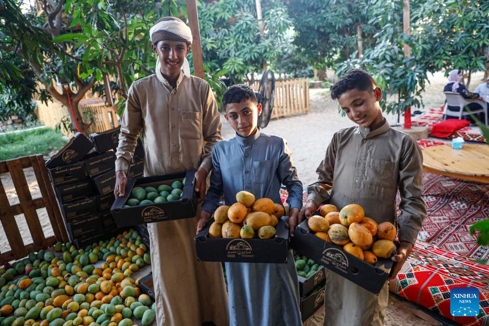 Farmers show newly-harvested mangoes at a farm in Ismailia Governorate, Egypt, on July 22, 2025. Mangoes have entered harvest season in Egypt. (Xinhua/Ahmed Gomaa)