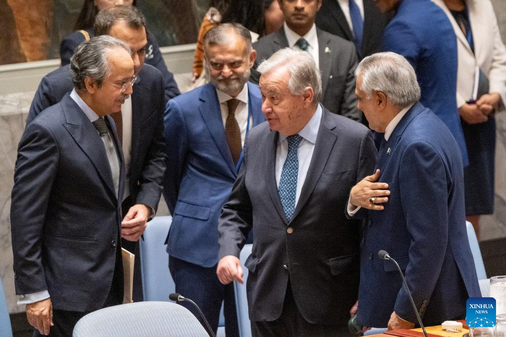 UN Secretary-General Antonio Guterres (2nd R, Front) speaks with delegates before a Security Council meeting at the UN headquarters in New York, on July 22, 2025. Guterres on Tuesday asked UN Security Council members to overcome their divisions. (Eskinder Debebe/UN Photo/Handout via Xinhua)