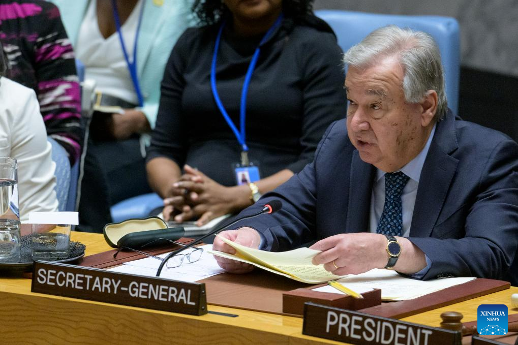 UN Secretary-General Antonio Guterres speaks at a Security Council meeting at the UN headquarters in New York, on July 22, 2025. Guterres on Tuesday asked UN Security Council members to overcome their divisions. (Eskinder Debebe/UN Photo/Handout via Xinhua)
