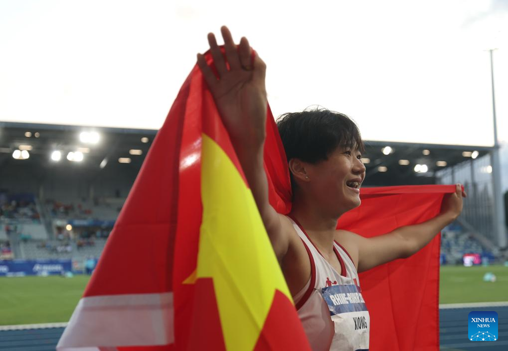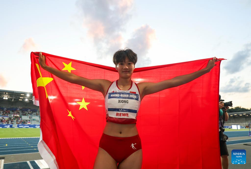 Xiong Shiqi of China celebrates after the women's long jump final at the Rhine-Ruhr 2025 FISU World University Games in Bochum, Germany, July 22, 2025. (Xinhua/Hu Xingyu)