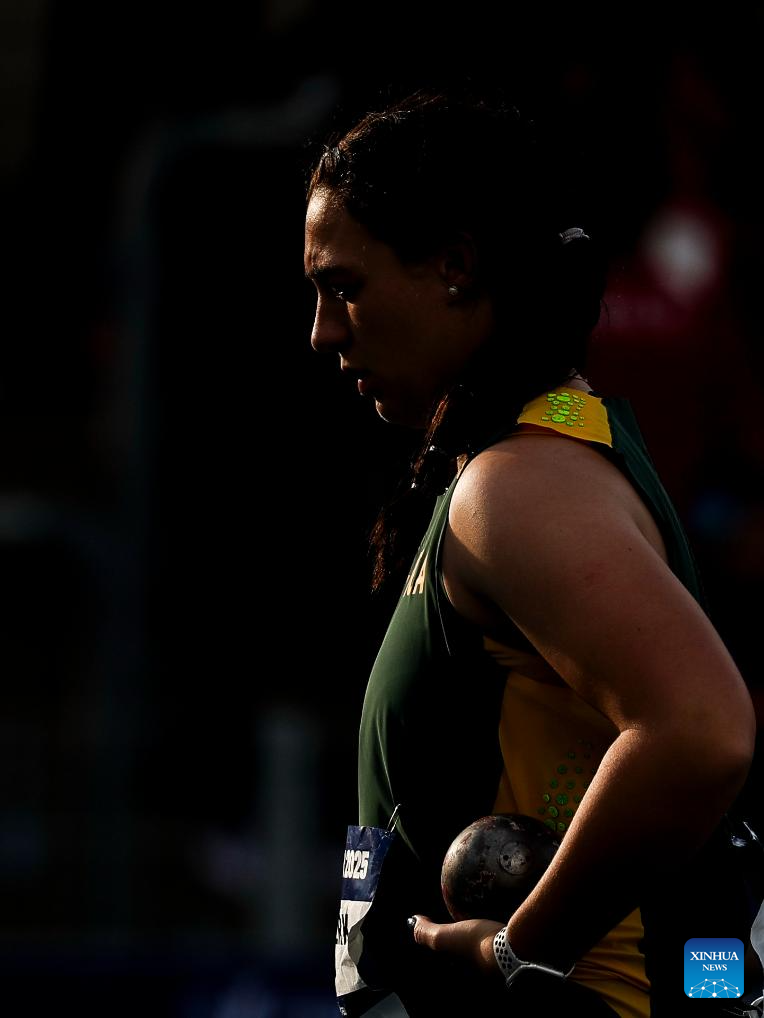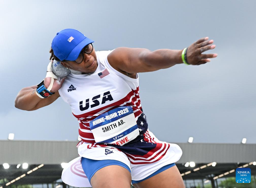 Abria Deonna Celene Smith of the United States competes during the women's shot put final at the Rhine-Ruhr 2025 FISU World University Games in Bochum, Germany, July 22, 2025. (Xinhua/Lian Yi)