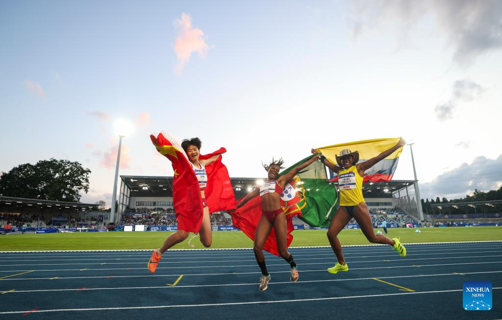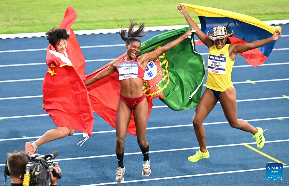 Gold medalist Agate Sousa (C) of Portugal, silver medalist Xiong Shiqi (L) of China and bronze medalist Natalia Carolina Linares Gonzalez of Colombia celebrate after the women's long jump final at the Rhine-Ruhr 2025 FISU World University Games in Bochum, Germany, July 22, 2025. (Xinhua/Lian Yi)