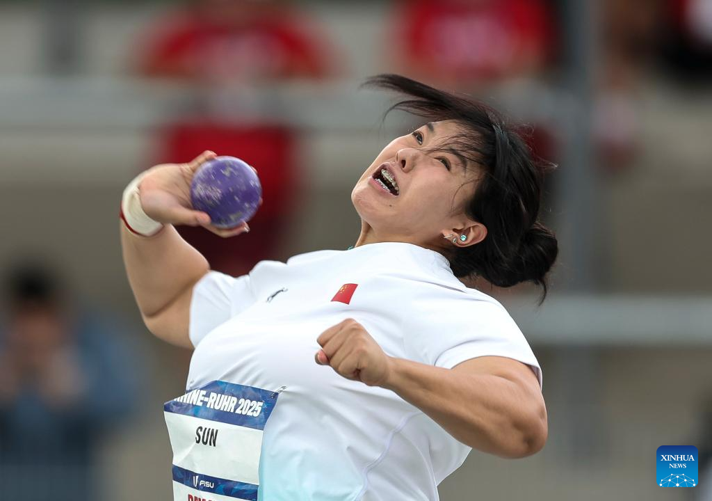 Sun Yue of China competes during the women's shot put final at the Rhine-Ruhr 2025 FISU World University Games in Bochum, Germany, July 22, 2025. (Xinhua/Hu Xingyu)