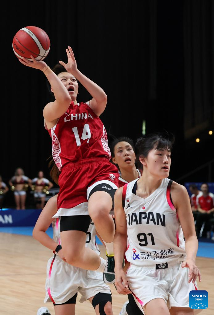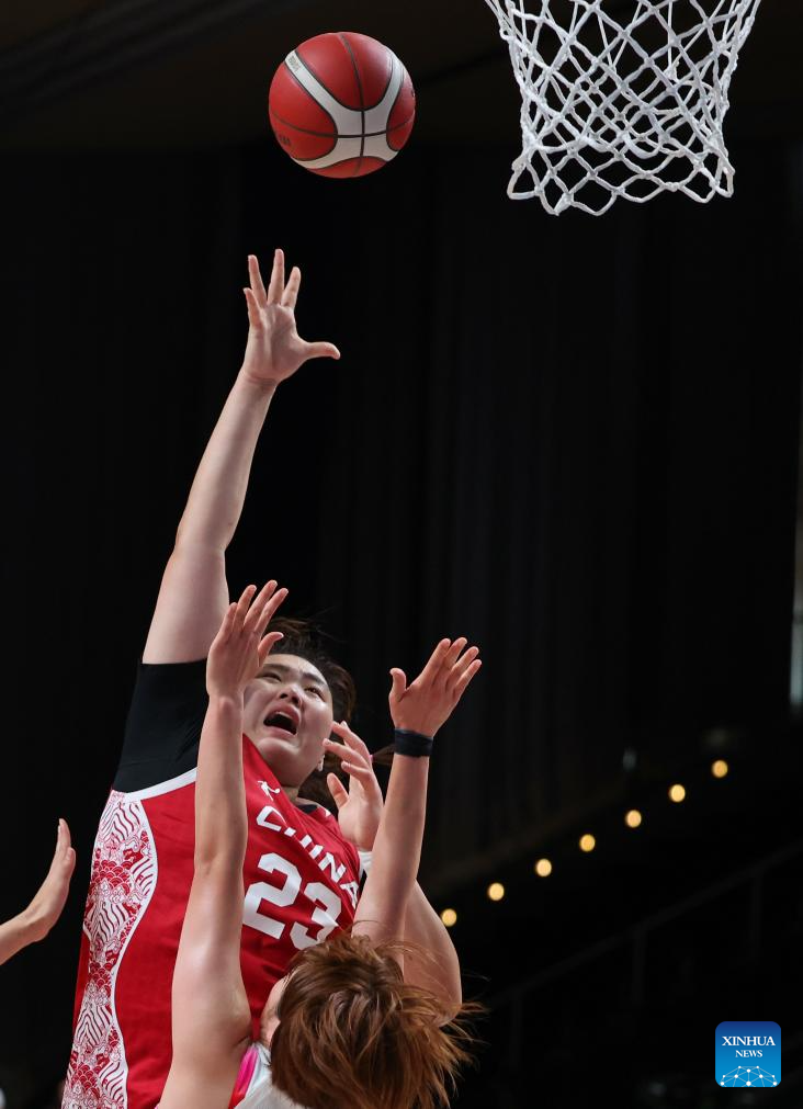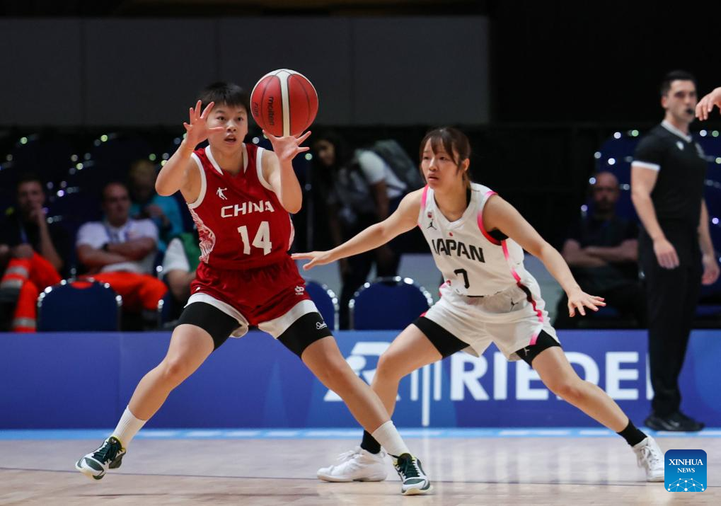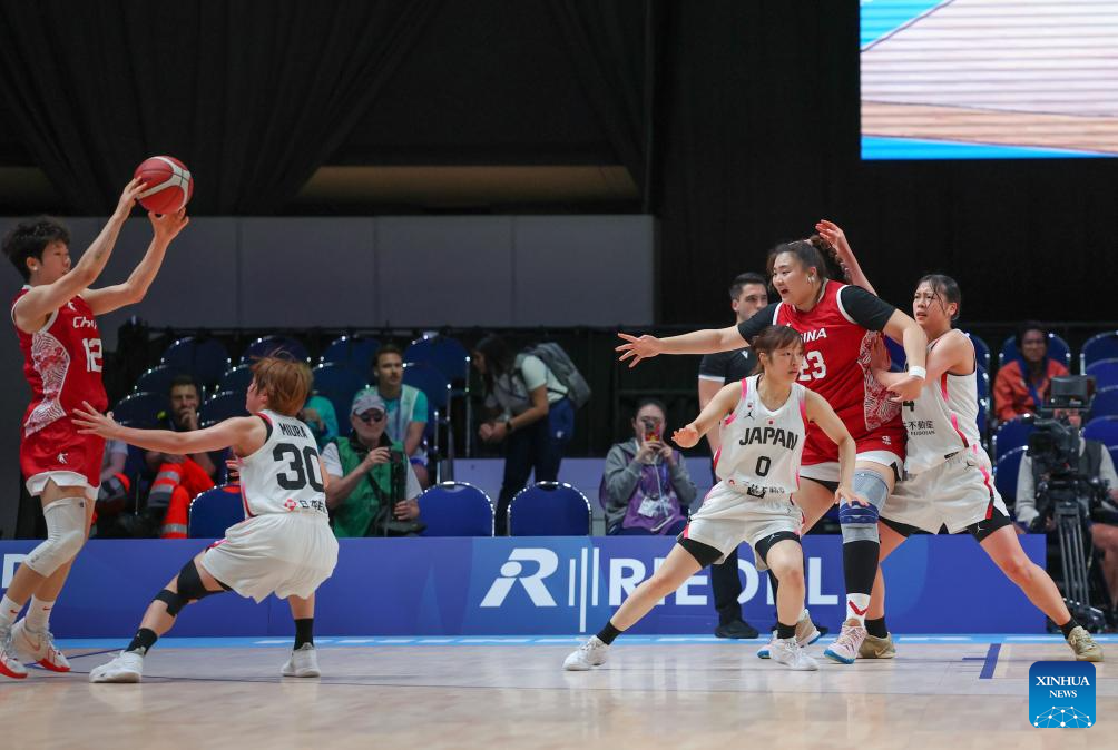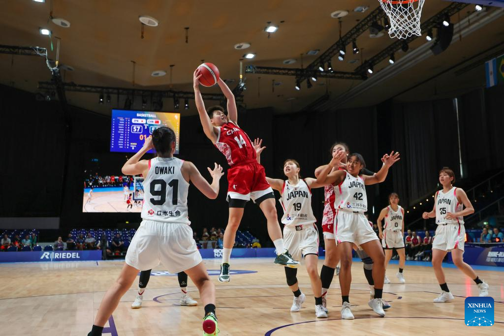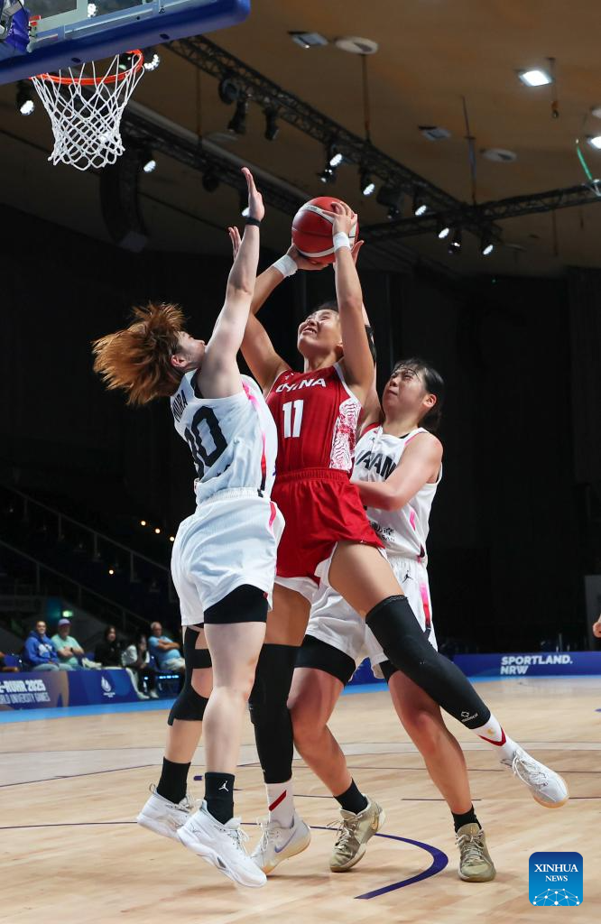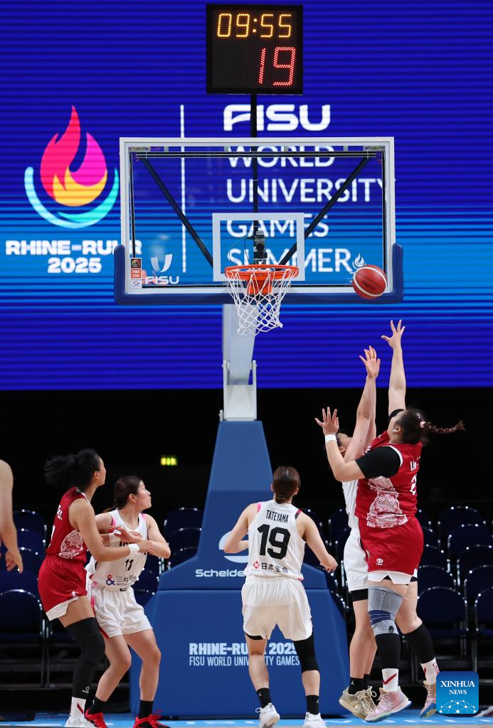 Chen Yujie (1st L) of China catches the ball during the women's basketball quaterfinal match between China and Japan at the Rhine-Ruhr 2025 FISU World University Games in Essen, Germany, July 22, 2025. (Xinhua/Zhang Fan)