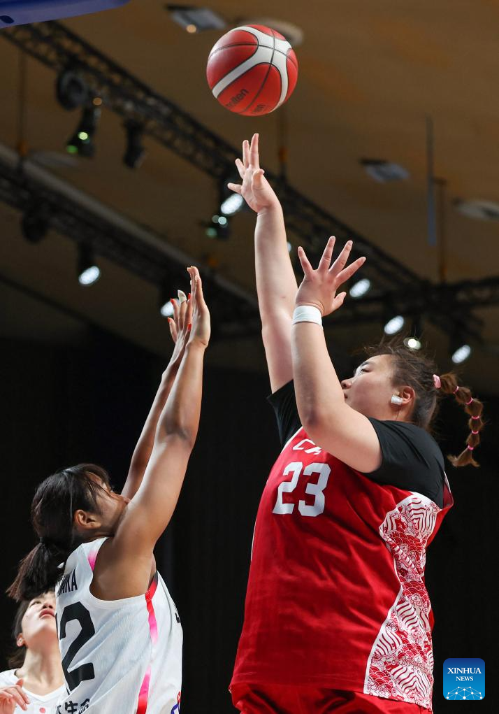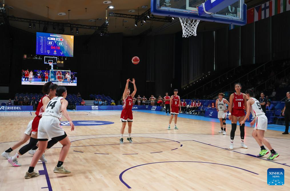 Cao Boyi (C) of China shoots a free throw during the women's basketball quaterfinal match between China and Japan at the Rhine-Ruhr 2025 FISU World University Games in Essen, Germany, July 22, 2025. (Xinhua/Zhang Fan)