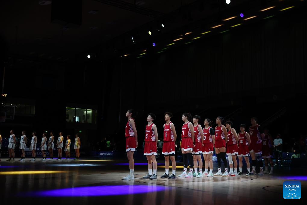 Players of China line up before the women's basketball quaterfinal match between China and Japan at the Rhine-Ruhr 2025 FISU World University Games in Essen, Germany, July 22, 2025. (Xinhua/Zhang Chen)