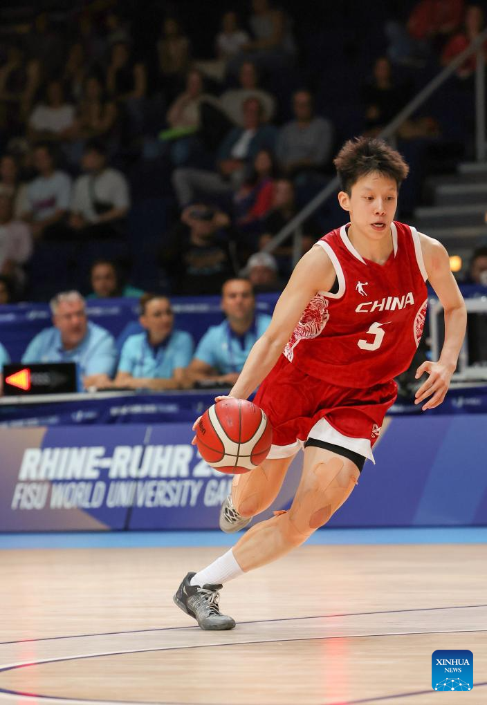 Tian Yuanyuan of China competes during the women's basketball quaterfinal match between China and Japan at the Rhine-Ruhr 2025 FISU World University Games in Essen, Germany, July 22, 2025. (Xinhua/Zhang Fan)