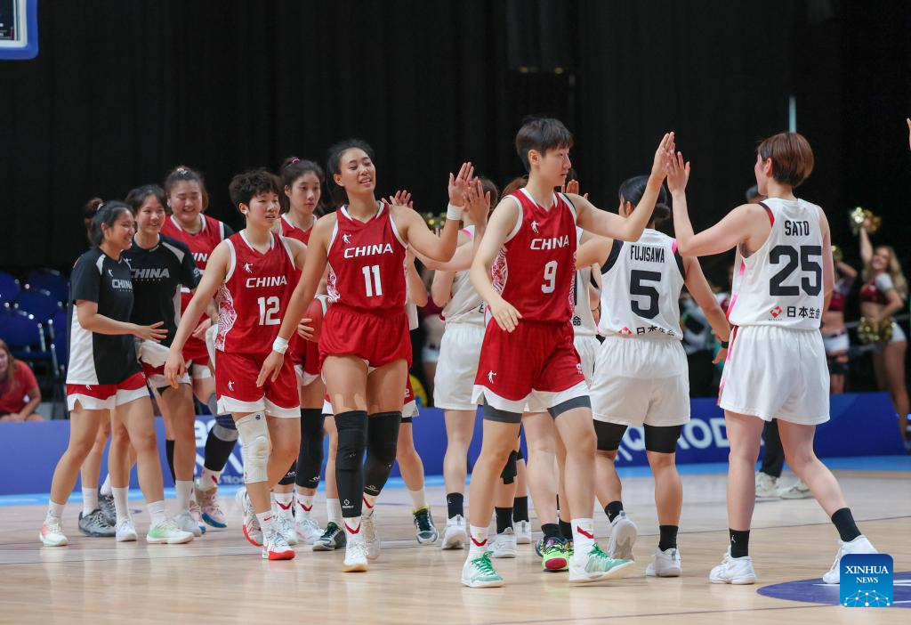 Players of China high-five with players of Japan after the women's basketball quaterfinal match between China and Japan at the Rhine-Ruhr 2025 FISU World University Games in Essen, Germany, July 22, 2025. (Xinhua/Zhang Fan)