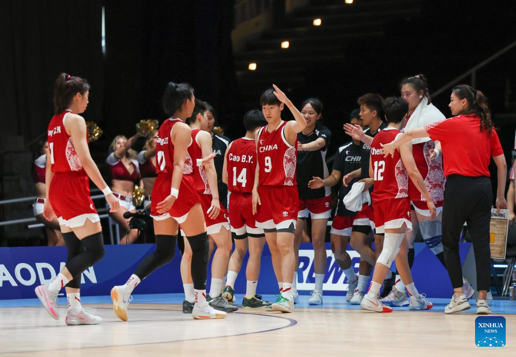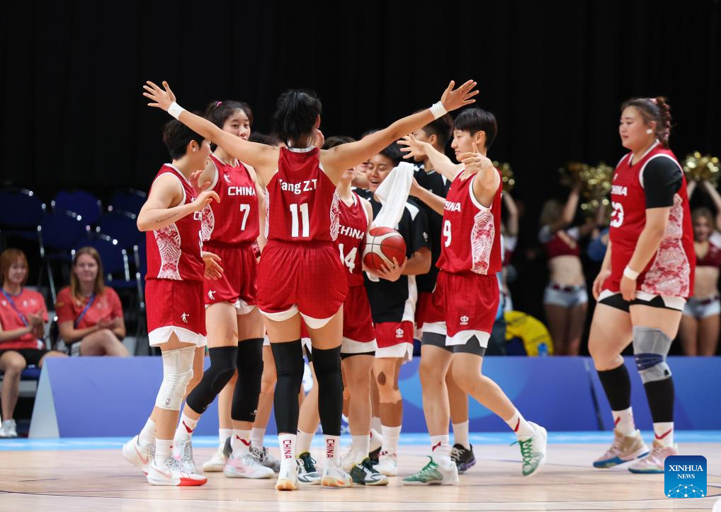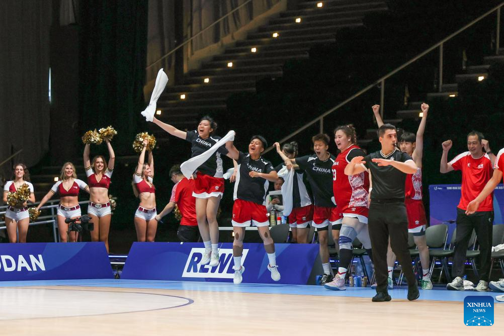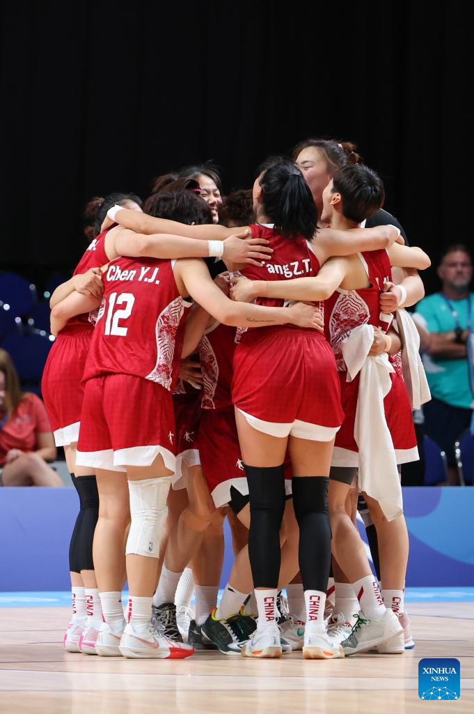 Players of China celebrate after winning the women's basketball quaterfinal match between China and Japan at the Rhine-Ruhr 2025 FISU World University Games in Essen, Germany, July 22, 2025. (Xinhua/Zhang Fan)