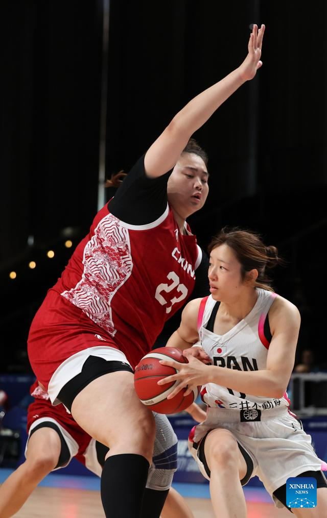 Cao Boyi (L) of China grabs the ball during the women's basketball quaterfinal match between China and Japan at the Rhine-Ruhr 2025 FISU World University Games in Essen, Germany, July 22, 2025. (Xinhua/Zhang Fan)