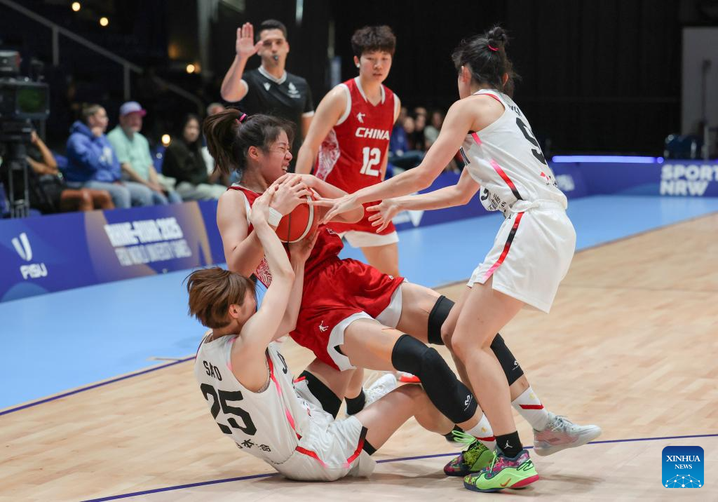 Zhang Zihan (C, front) of China fights for the ball with Sato Takako (L, front) and Owaki Haru (R, front) of Japan during the women's basketball quaterfinal match between China and Japan at the Rhine-Ruhr 2025 FISU World University Games in Essen, Germany, July 22, 2025. (Xinhua/Zhang Fan)