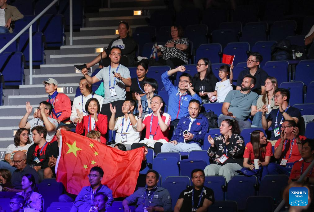 Supporters cheer for players of China during the women's basketball quaterfinal match between China and Japan at the Rhine-Ruhr 2025 FISU World University Games in Essen, Germany, July 22, 2025. (Xinhua/Zhang Fan)