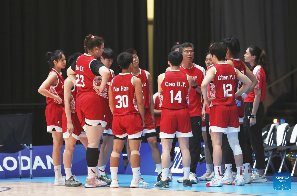 Players of China cheer up during the women's basketball quaterfinal match between China and Japan at the Rhine-Ruhr 2025 FISU World University Games in Essen, Germany, July 22, 2025. (Xinhua/Zhang Fan)