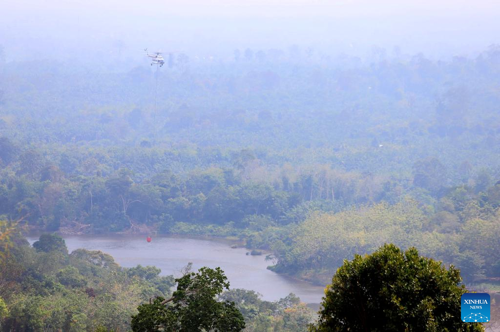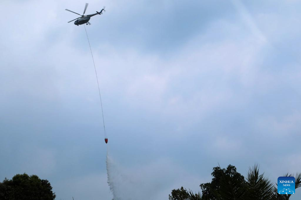 A water bombing helicopter tries to extinguish a forest and land fire at Rokan Hulu regency in Riau province, Indonesia on July 24, 2025. Indonesian authorities were accelerating efforts to tackle forest and land fires, particularly in Riau province and other regions across Sumatra Island in the country's western territories. According to the Coordinating Ministry for Political and Security Affairs, a spike in hotspots was detected in Riau between July 19 and 20, with smoke potentially drifting to neighboring countries. (Indonesia's National Disaster And Mitigation Agency/Handout via Xinhua)