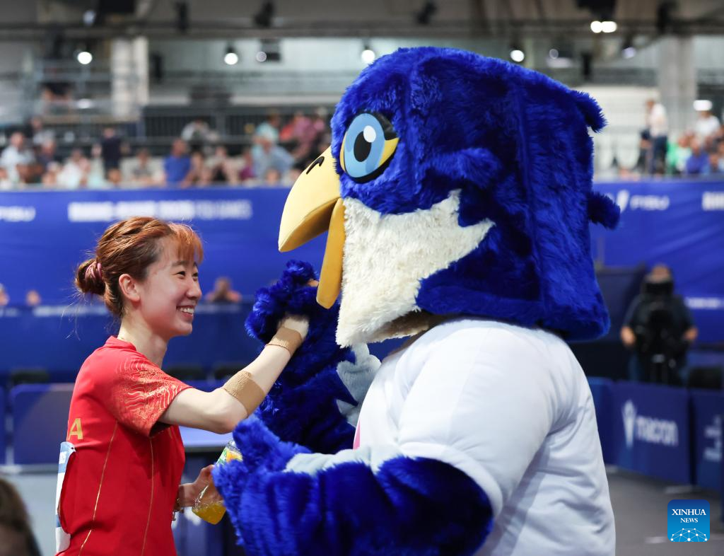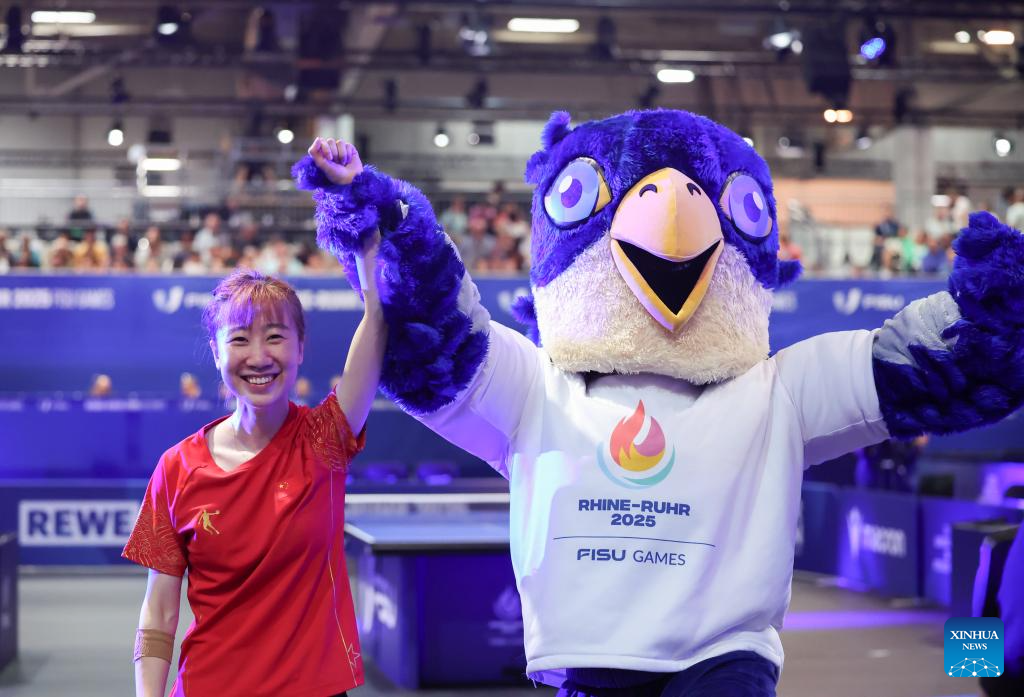 Zhao Shang (L) of China celebrates with mascot Wanda after winning the table tennis women's singles gold medal match between Zhao Shang of China and Huang Yu-jie of Chinese Taipei at the Rhine-Ruhr 2025 FISU World University Games in Essen, Germany, July 24, 2025. (Xinhua/Zhang Fan)