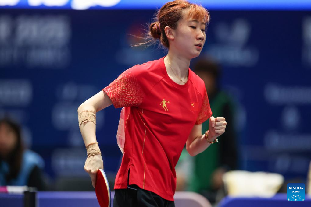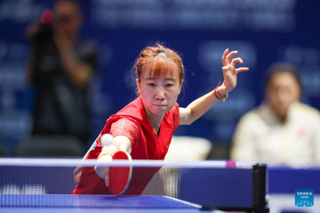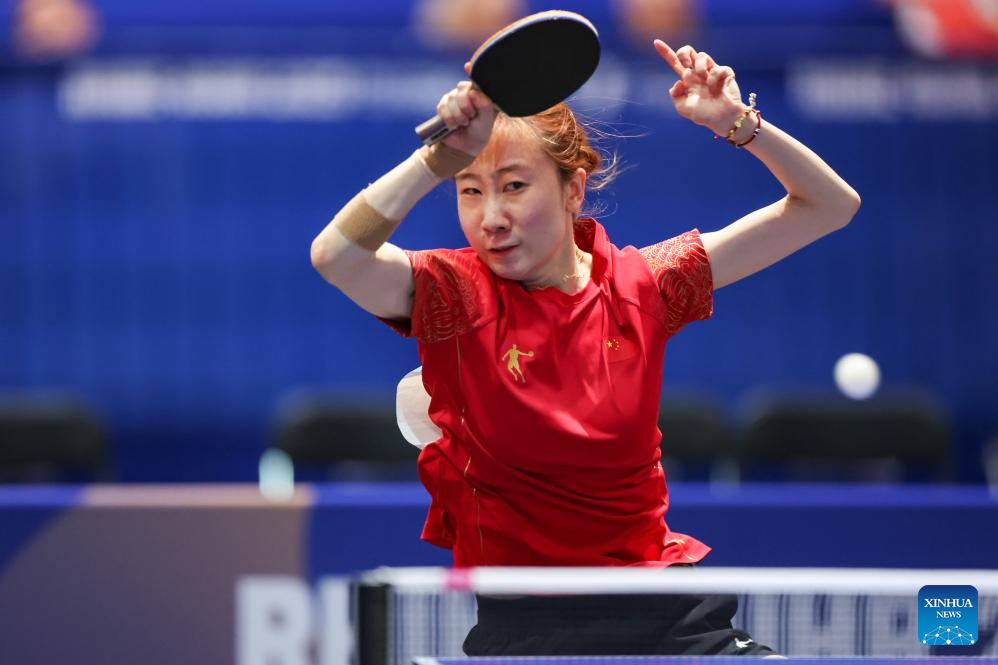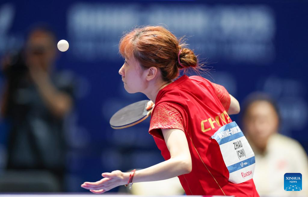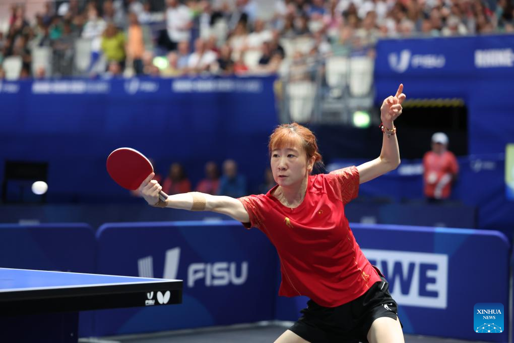 Zhao Shang of China competes during the table tennis women's singles gold medal match between Zhao Shang of China and Huang Yu-jie of Chinese Taipei at the Rhine-Ruhr 2025 FISU World University Games in Essen, Germany, July 24, 2025. (Xinhua/Zhang Fan)