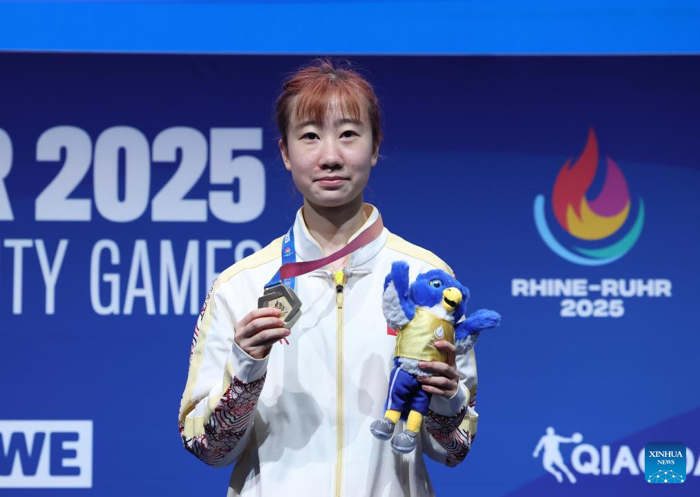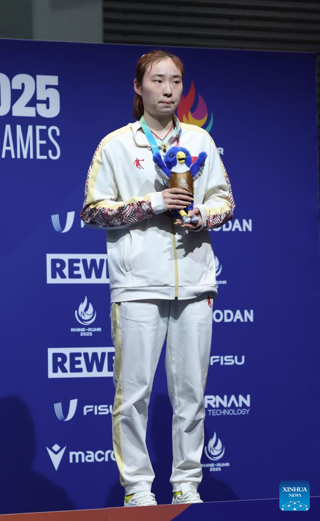 Gold medalist Zhao Shang of China poses during the awarding ceremony for the table tennis women's singles at the Rhine-Ruhr 2025 FISU World University Games in Essen, Germany, July 24, 2025. (Xinhua/Zhang Fan)