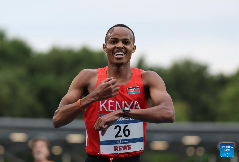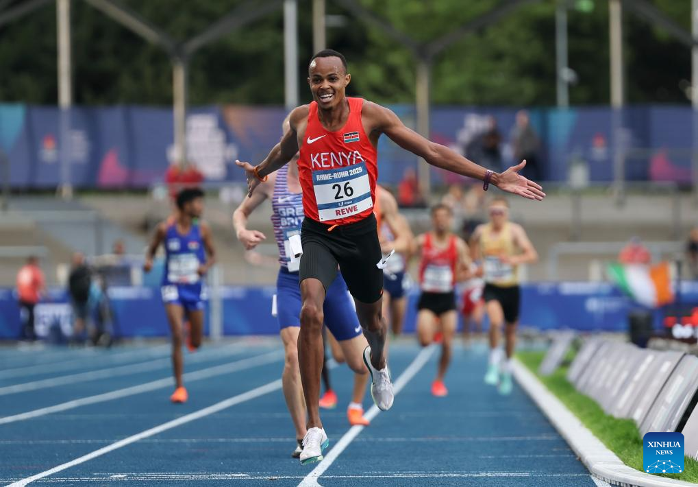 Brian Muange Musau of Kenya celebrates after the men's 10000m final at the Rhine-Ruhr 2025 FISU World University Games in Bochum, Germany, July 23, 2025. (Xinhua/Hu Xingyu)