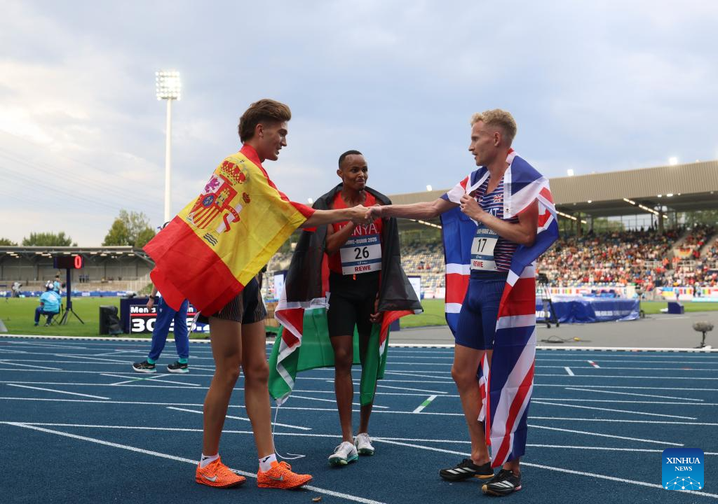 Gold medalist Brian Muange Musau (C) of Kenya, silver medalist David Steven Mullarkey (R) of Britain and bronze medalist Mario Priego Montero of Spain greet each other after the men's 10000m final at the Rhine-Ruhr 2025 FISU World University Games in Bochum, Germany, July 23, 2025. (Xinhua/Hu Xingyu)