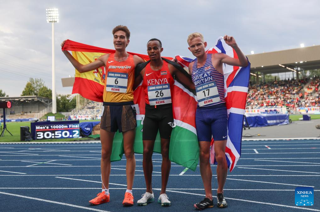 Gold medalist Brian Muange Musau (C) of Kenya, silver medalist David Steven Mullarkey (R) of Britain and bronze medalist Mario Priego Montero of Spain pose for photos after the men's 10000m final at the Rhine-Ruhr 2025 FISU World University Games in Bochum, Germany, July 23, 2025. (Xinhua/Hu Xingyu)