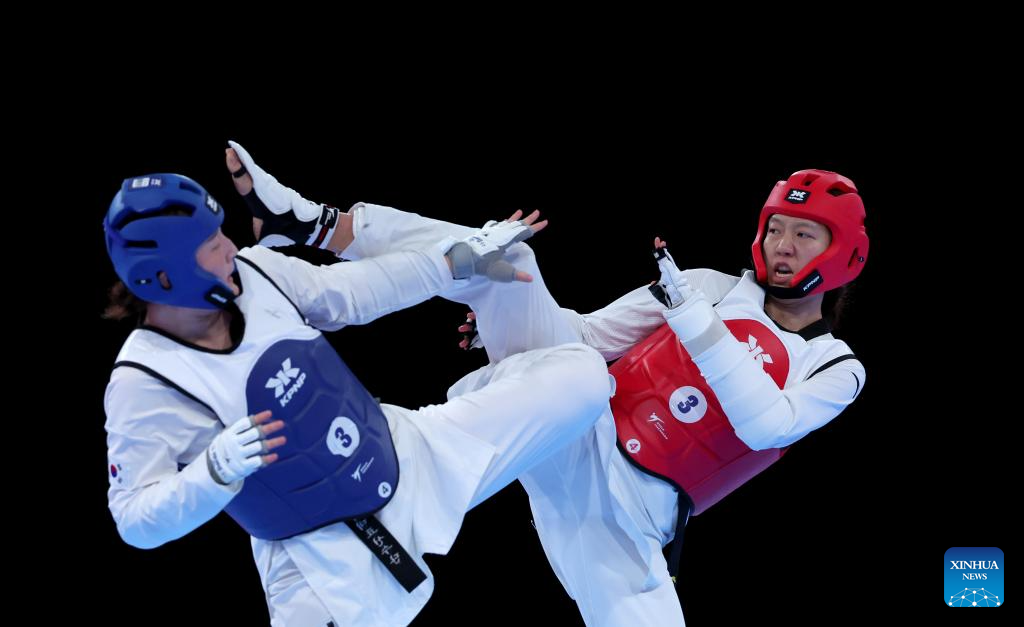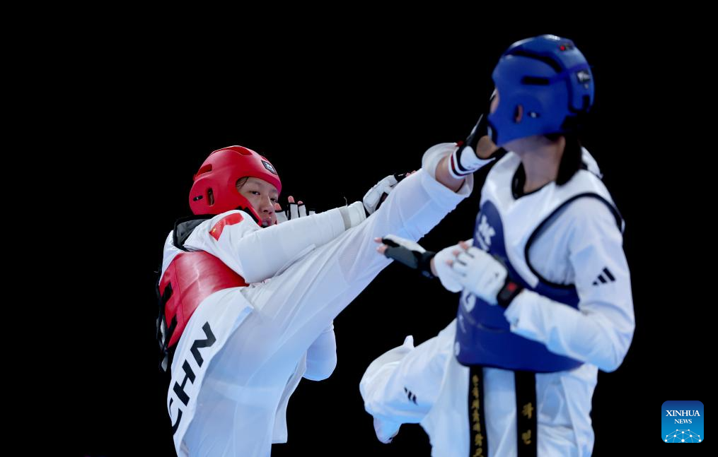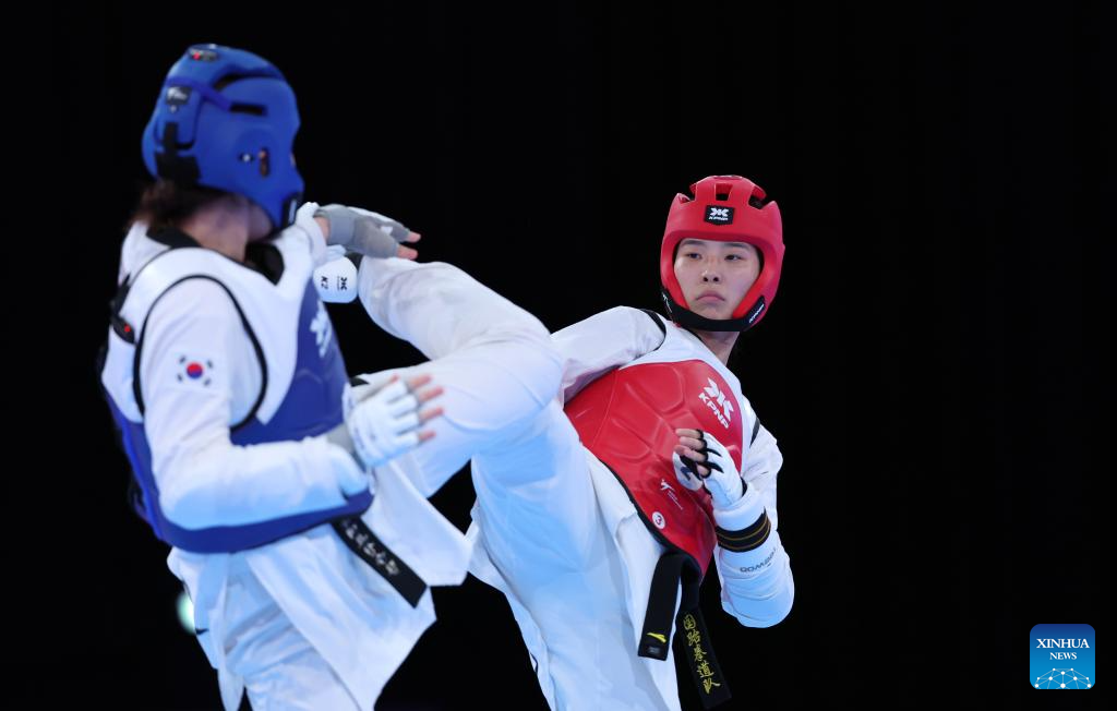 Mu Wenzhe (L) of China competes during the women's team final of taekwondo between China and South Korea at the Rhine-Ruhr 2025 FISU World University Games in Essen, Germany, July 23, 2025. (Xinhua/Li Ying)