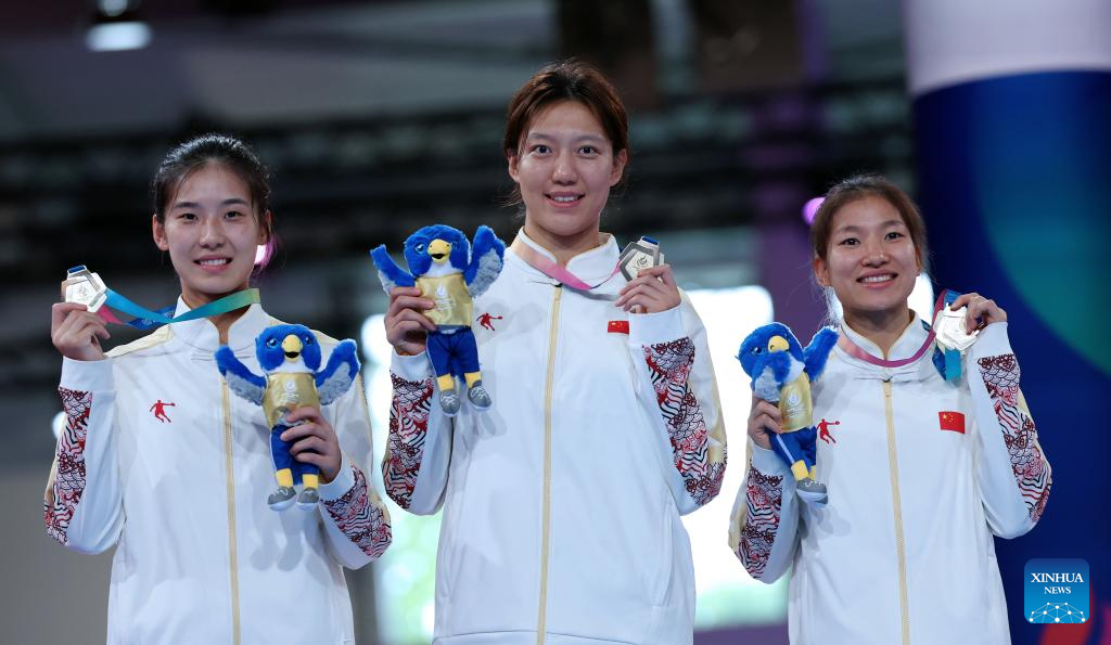 Gold medalists Mu Wenzhe (C), Xing Jiani (L) and Guo Qing of China pose during the awarding ceremony after the women's team final of taekwondo between China and South Korea at the Rhine-Ruhr 2025 FISU World University Games in Essen, Germany, July 23, 2025. (Xinhua/Li Ying)