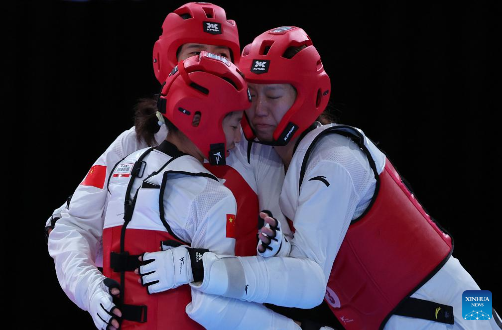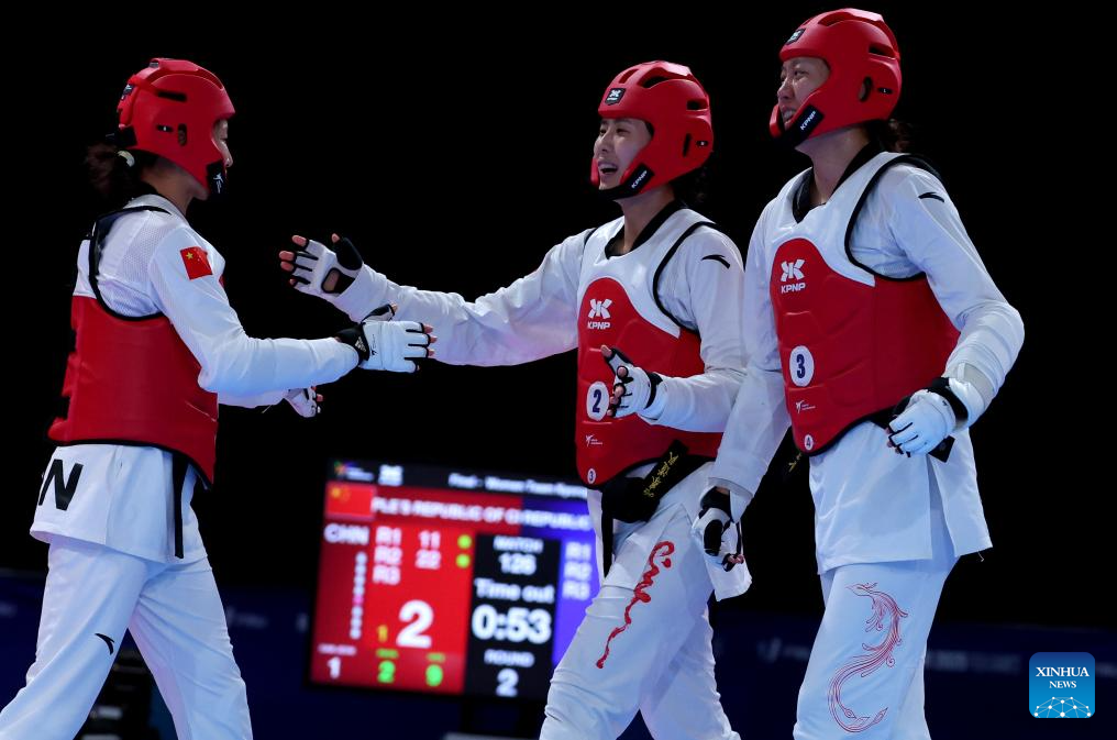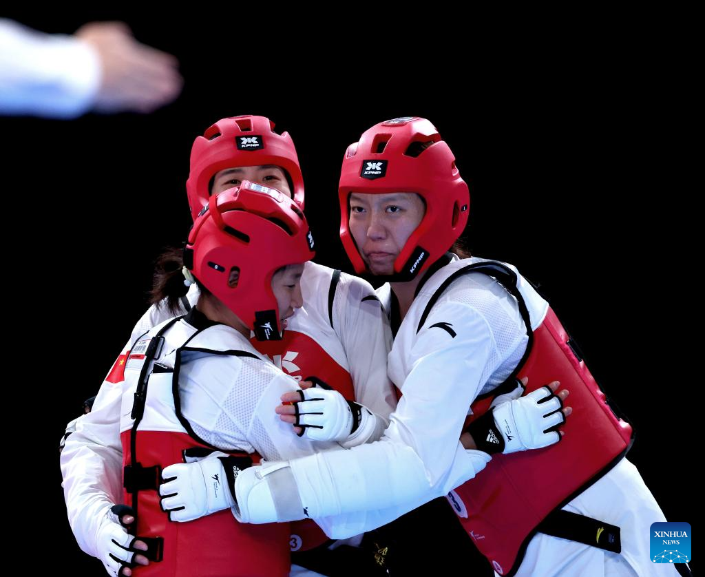 Xing Jiani (C) and Mu Wenzhe (L) of China celebrate winning the women's team final of taekwondo between China and South Korea at the Rhine-Ruhr 2025 FISU World University Games in Essen, Germany, July 23, 2025. (Xinhua/Li Ying)