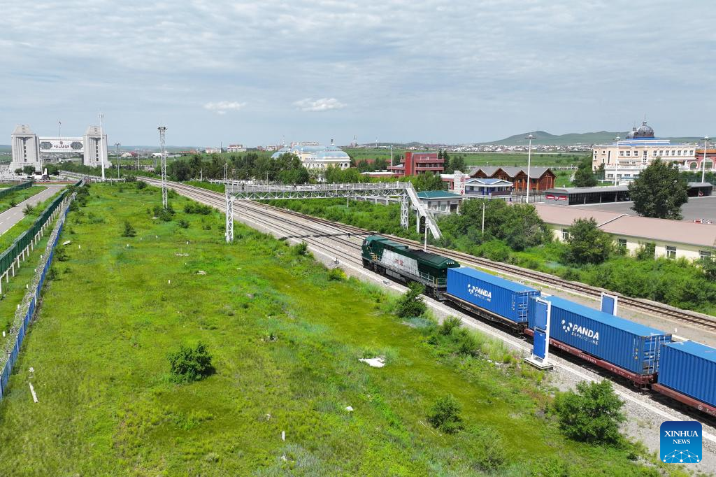 An aerial drone photo taken on July 24, 2025 shows a freight train departing from the railway station in Manzhouli, north China's Inner Mongolia Autonomous Region. The Manzhouli railway port, China's largest land port, has handled 30,000 China-Europe freight train trips and nearly 3 million TEUs (twenty-foot equivalent units) of goods since 2013. (Photo by Huang Xu/Xinhua)