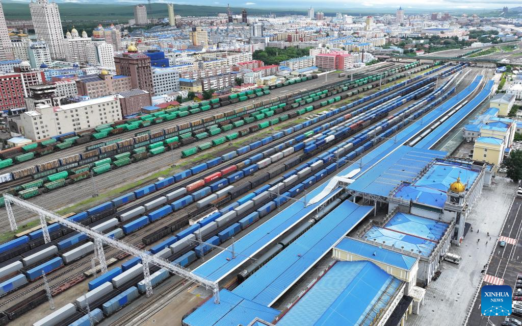 An aerial drone photo taken on July 25, 2025 shows freight trains preparing to depart from the railway station in Manzhouli, north China's Inner Mongolia Autonomous Region. The Manzhouli railway port, China's largest land port, has handled 30,000 China-Europe freight train trips and nearly 3 million TEUs (twenty-foot equivalent units) of goods since 2013. (Photo by Huang Xu/Xinhua)