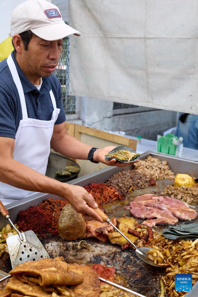 A street vendor prepares tacos at a tianguis market in Mexico City, Mexico, on July 24, 2025. Tianguis is an open-air market or bazaar that is traditionally held on certain market days in a town or city neighbourhood in Mexico and Central America. (Xinhua/Meng Dingbo)