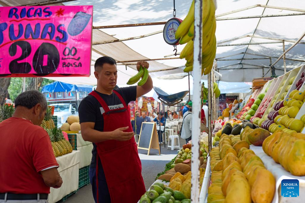 A street vendor sells bananas at a tianguis market in Mexico City, Mexico, on July 24, 2025. Tianguis is an open-air market or bazaar that is traditionally held on certain market days in a town or city neighbourhood in Mexico and Central America. (Xinhua/Meng Dingbo)