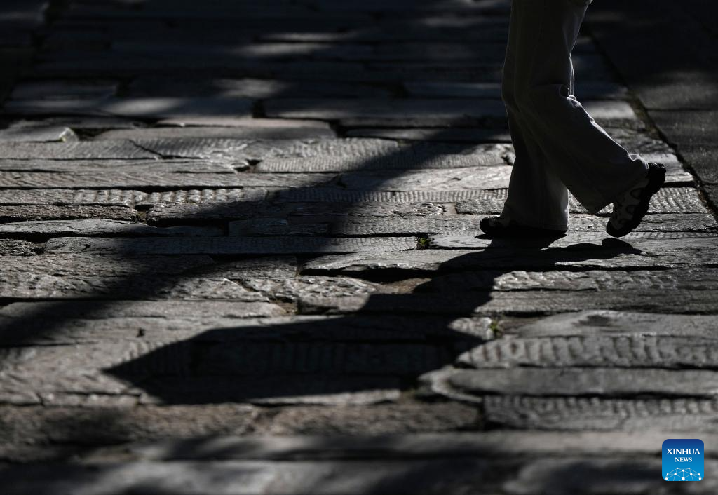 A tourist walks on relics of the ancient path at the Wuhouci Shrine in Mianxian County in Hanzhong, northwest China's Shaanxi Province, July 22, 2025. For more than 2,300 years, Hanzhong has served as a vital nexus for the river network and transportation routes connecting the north and south. (Xinhua/Li Yibo)