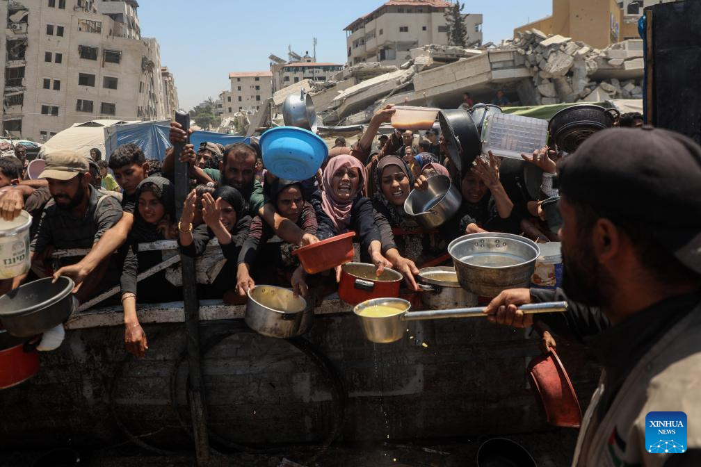Palestinians wait to receive free food from a charity kitchen in Gaza City, on July 24, 2025. The Palestinians are facing "the biggest humanitarian catastrophe" of their time amid the ongoing conflict in Gaza and the West Bank, due to the failure of global efforts to deter Israeli actions, Palestinian President Mahmoud Abbas said Thursday. (Photo by Rizek Abdeljawad/Xinhua)