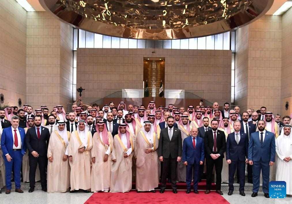 Syrian and Saudi officials pose for a group photo during Syrian-Saudi Investment Forum in Damascus, Syria, on July 24, 2025. Syria and Saudi Arabia signed 46 agreements and memoranda of understanding worth 6 billion U.S. dollars here on Thursday during a high-level investment forum, according to Syria's state-run SANA news agency. (Photo by Ammar Safarjalani/Xinhua)