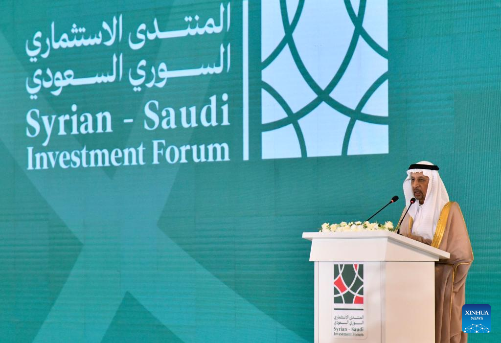 Saudi Investment Minister Khalid Al-Falih speaks during Syrian-Saudi Investment Forum in Damascus, Syria, on July 24, 2025. Syria and Saudi Arabia signed 46 agreements and memoranda of understanding worth 6 billion U.S. dollars here on Thursday during a high-level investment forum, according to Syria's state-run SANA news agency. (Photo by Ammar Safarjalani/Xinhua)