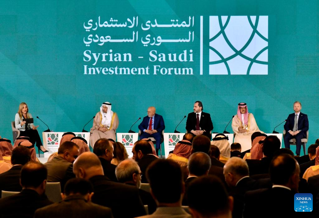 Panelists attend a session of Syrian-Saudi Investment Forum in Damascus, Syria, on July 24, 2025. Syria and Saudi Arabia signed 46 agreements and memoranda of understanding worth 6 billion U.S. dollars here on Thursday during a high-level investment forum, according to Syria's state-run SANA news agency. (Photo by Ammar Safarjalani/Xinhua)