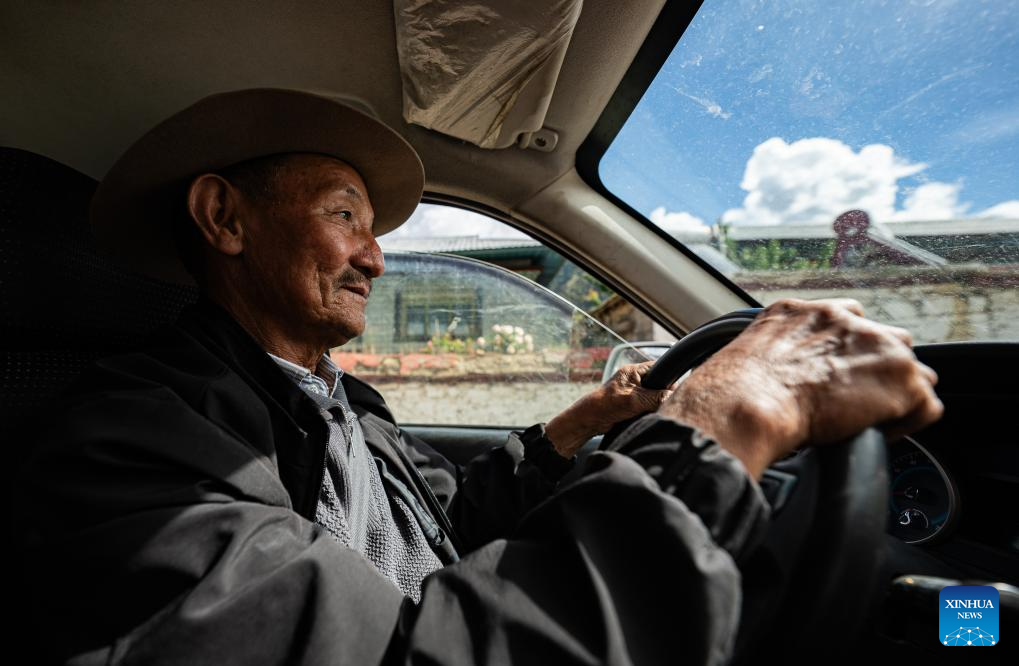 Tobgye drives to Linze ecological and cultural scenic area in Linze Village of Gongbo'Gyamda County, Nyingchi City, southwest China's Xizang Autonomous Region, on July 23, 2025. Linze Village in Gongbo'Gyamda County is a well-known habitat of the Tibetan macaque, a national second-class protected animal.