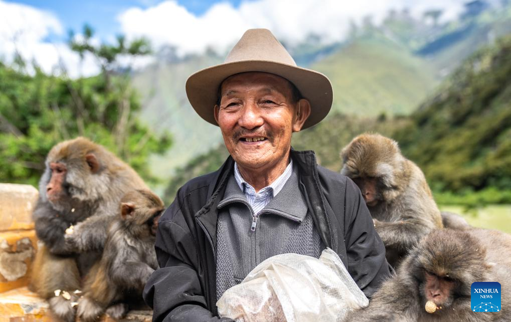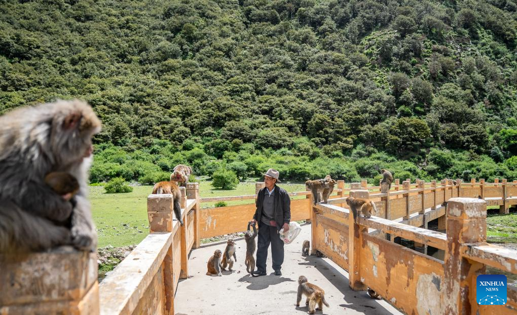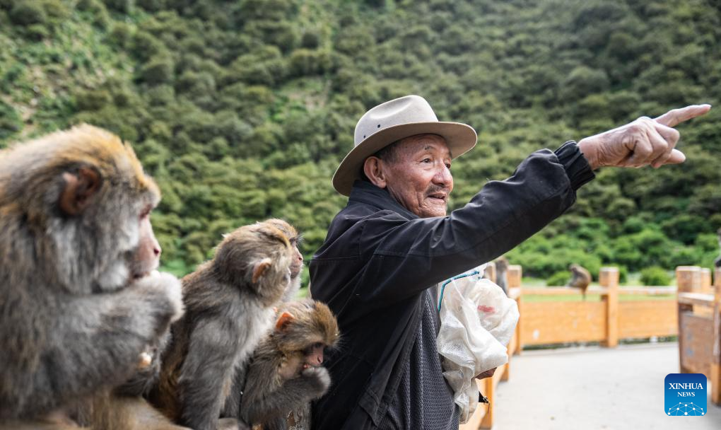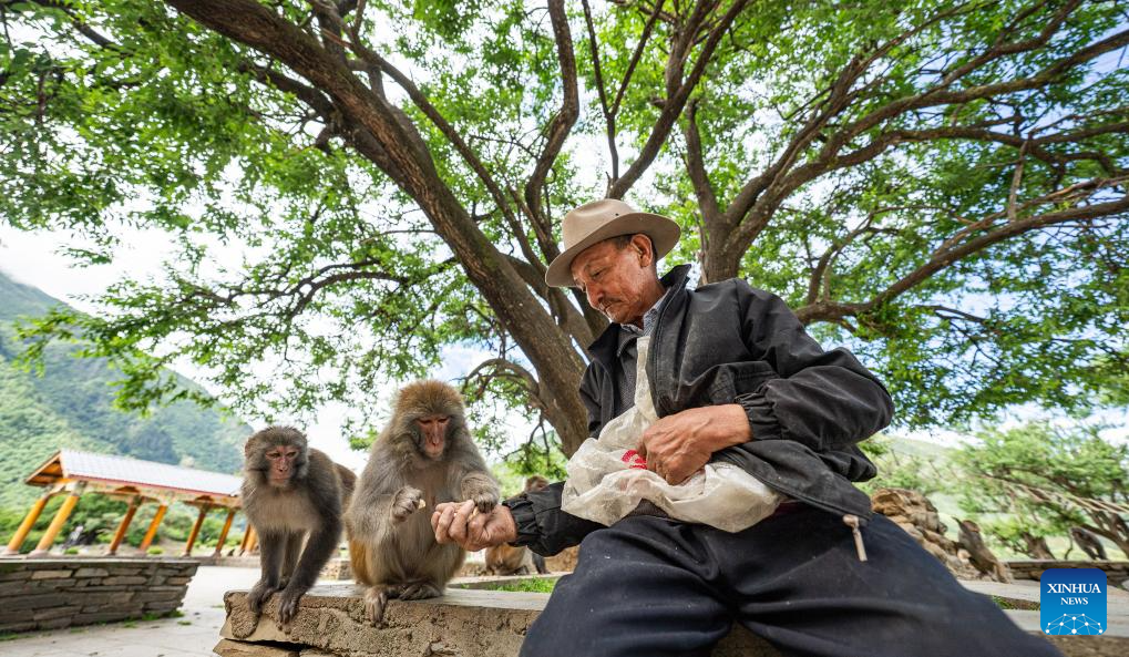 Tobgye feeds peanuts to Tibetan macaques at Linze ecological and cultural scenic area in Linze Village of Gongbo'Gyamda County, Nyingchi City, southwest China's Xizang Autonomous Region, on July 23, 2025. Linze Village in Gongbo'Gyamda County is a well-known habitat of the Tibetan macaque, a national second-class protected animal.