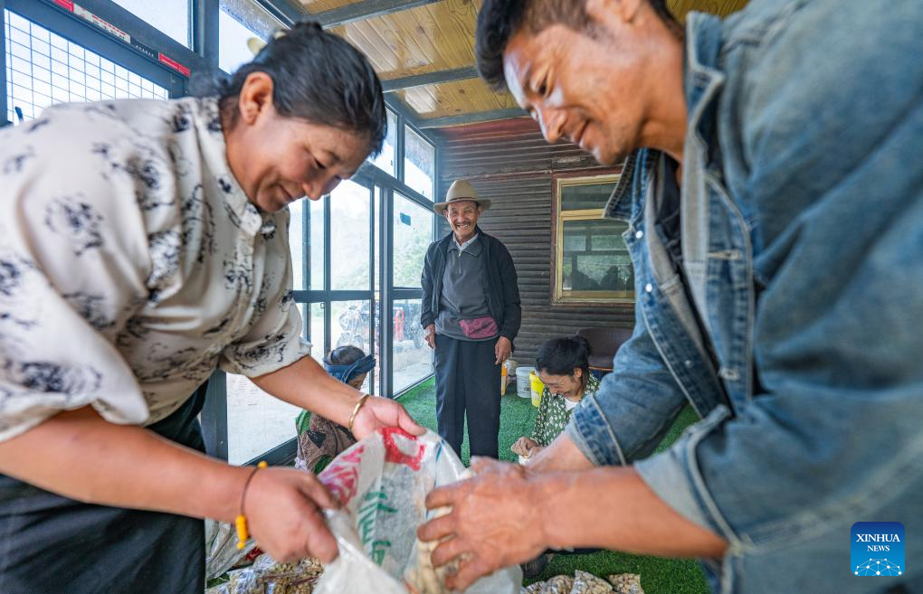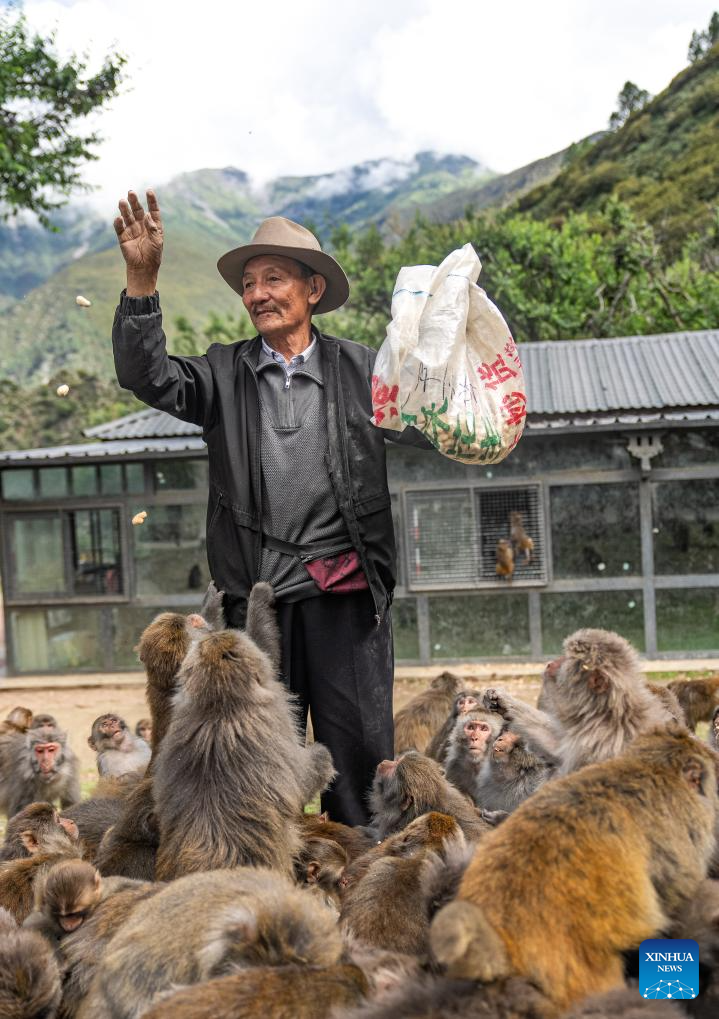 Staff members prepare peanuts for Tobgye (C) to feed Tibetan macaques at Linze ecological and cultural scenic area in Linze Village of Gongbo'Gyamda County, Nyingchi City, southwest China's Xizang Autonomous Region, on July 23, 2025. Linze Village in Gongbo'Gyamda County is a well-known habitat of the Tibetan macaque, a national second-class protected animal.