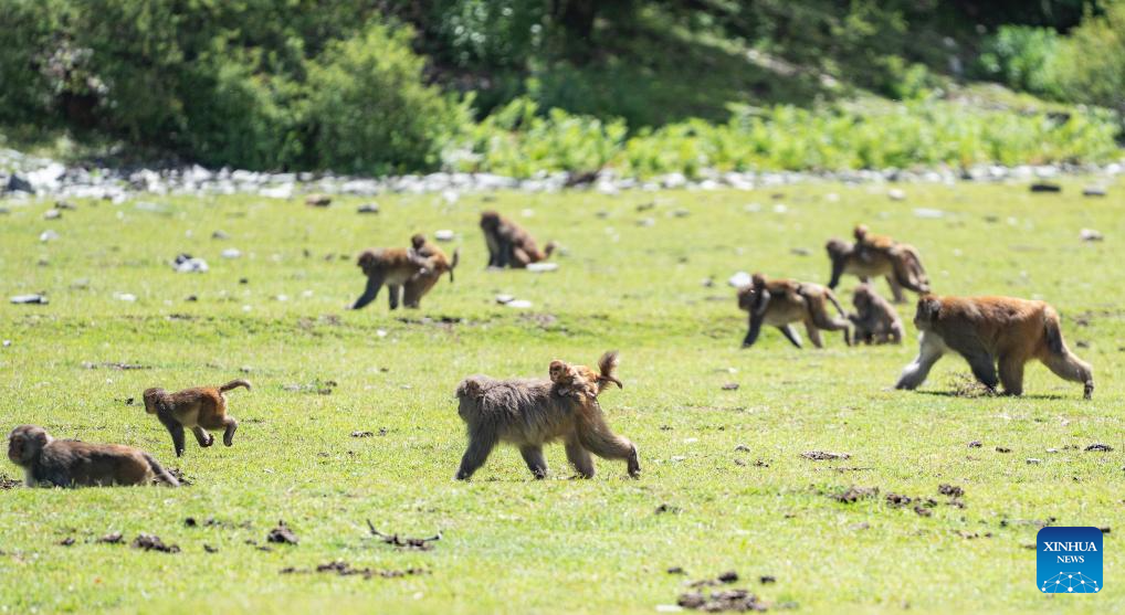 Tibetan macaques are pictured at Linze ecological and cultural scenic area in Linze Village of Gongbo'Gyamda County, Nyingchi City, southwest China's Xizang Autonomous Region, on July 23, 2025. Linze Village in Gongbo'Gyamda County is a well-known habitat of the Tibetan macaque, a national second-class protected animal.
