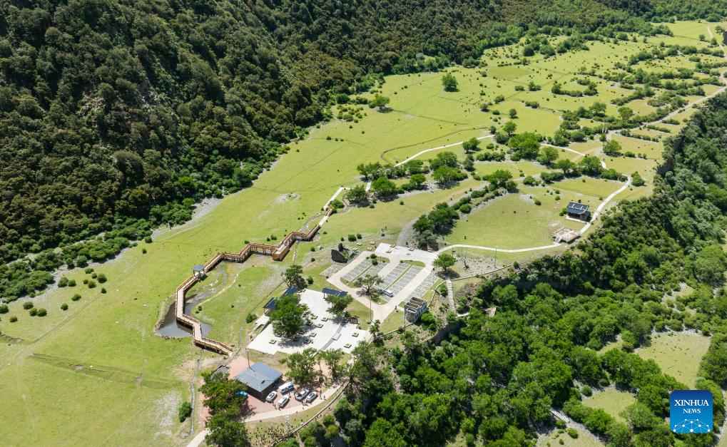 An aerial drone photo taken on July 23, 2025 shows a view of the Linze ecological and cultural scenic area in Linze Village of Gongbo'Gyamda County, Nyingchi City, southwest China's Xizang Autonomous Region. Linze Village in Gongbo'Gyamda County is a well-known habitat of the Tibetan macaque, a national second-class protected animal.