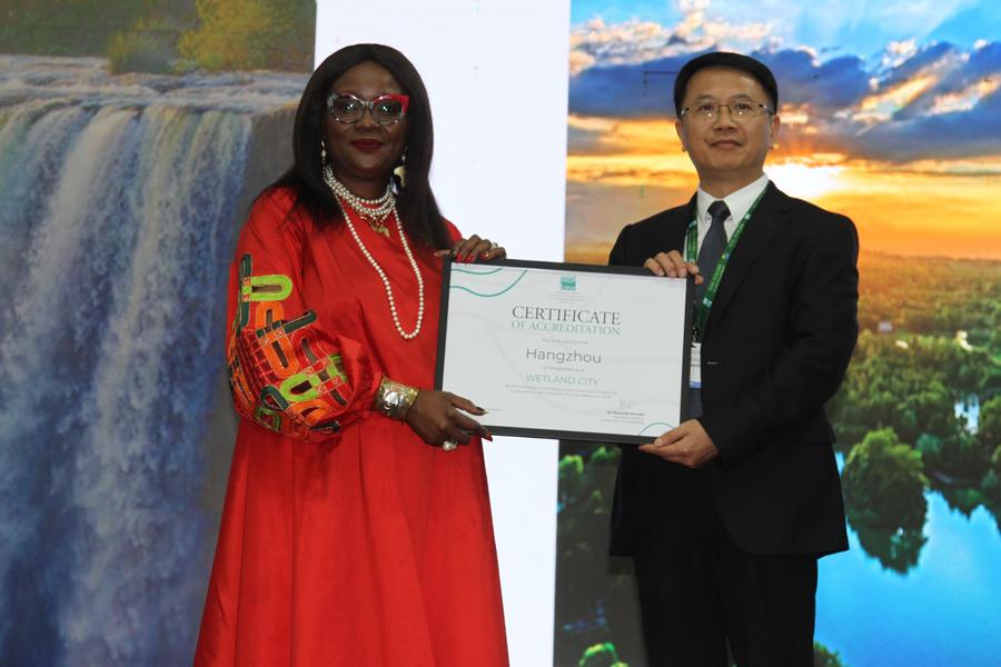 Nine Chinese cities were accredited as international wetland cities on Thursday during the opening of the COP15 in Zimbabwe, raising China's total to 22, the highest globally.